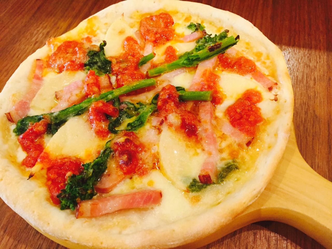 今日おすすめするのは たけのこと菜の花のピザです(^ ^) たけのこのシャキシャキ感と しんなり菜の花(*’-'*) ピザ生地も出来立てですよ〜♪