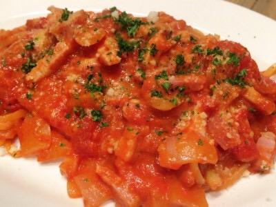厚切りのベーコンとチーズがたっぷり入った食べ応えのある濃厚トマトソースパスタです!