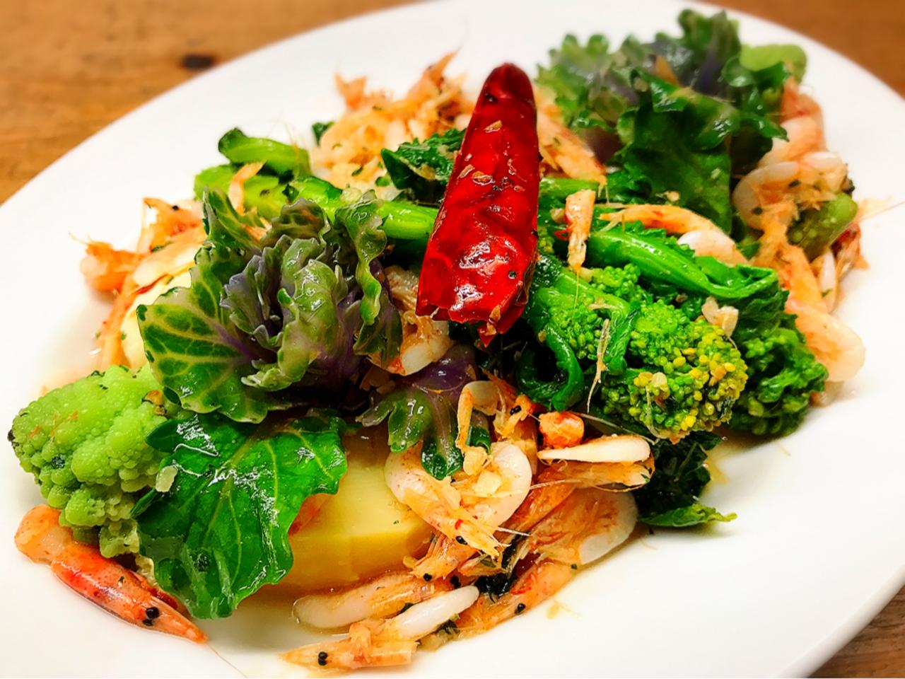 「桜海老と春野菜のガーリックソテー」 旬の桜海老とたっぷり春野菜をガーリックソテーに! すっきりとした辛口白ワインと良く合います♪