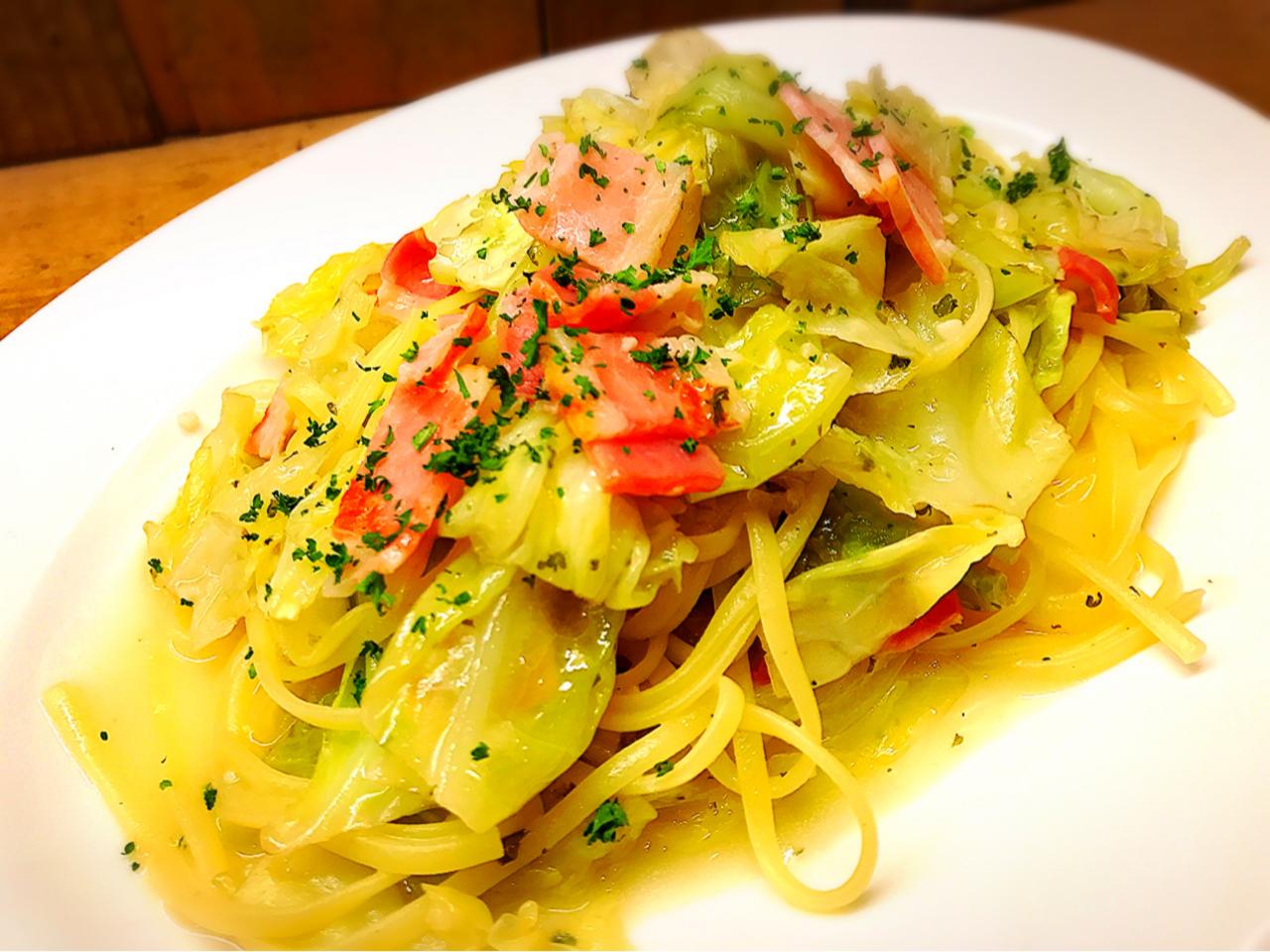 「春キャベツとベーコンのハーブバターソースのパスタ」
