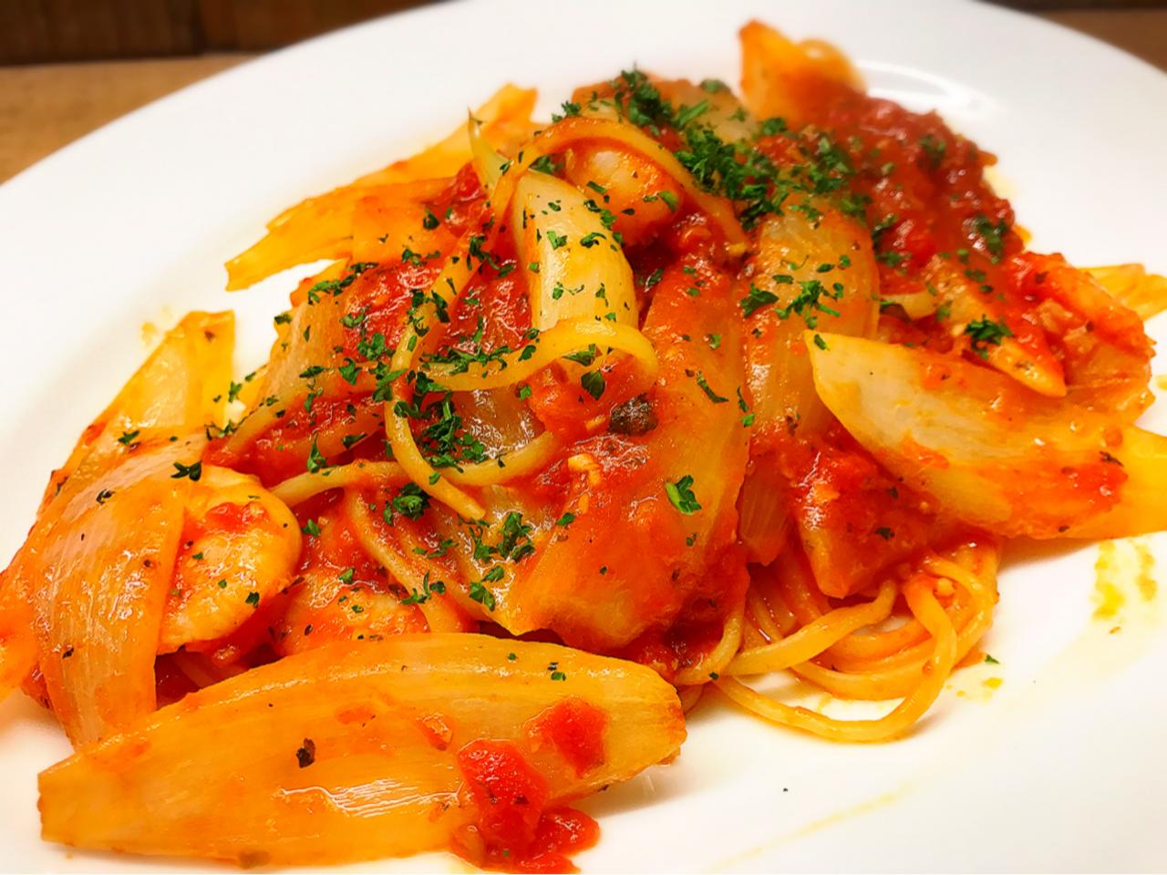 甘みたっぷり!旬の新玉葱とぷりぷりの海老がたっぷり入ったトマトソースパスタです!