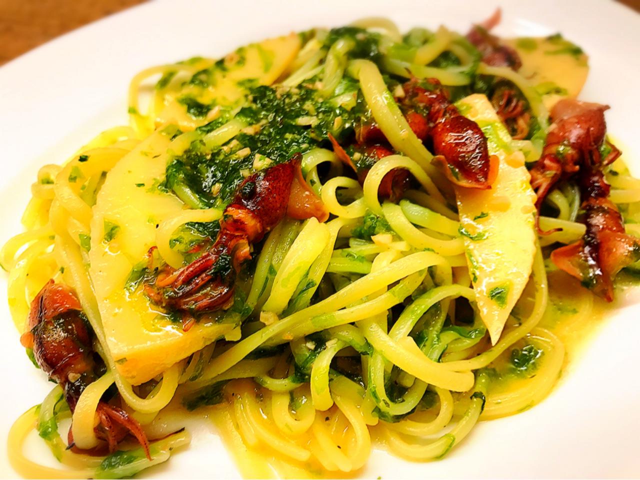 「ホタルイカと筍の生海苔ソースのパスタ」 生海苔の香りが口いっぱいに広がる、 旬の筍とホタルイカがたっぷり入ったパスタ!
