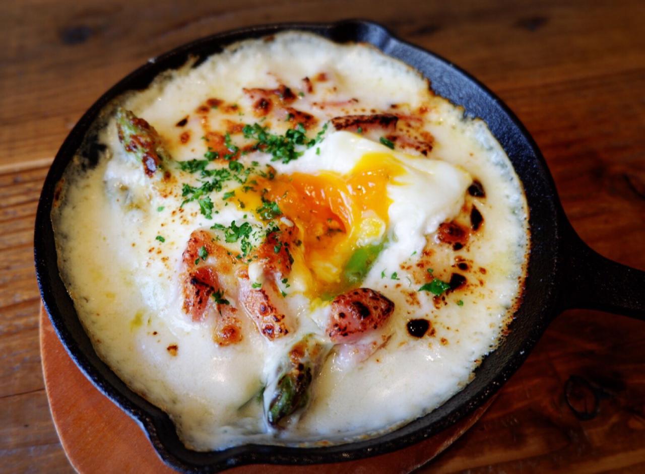 旬のアスパラにたっぷりチーズとトロトロ半熟卵を乗せてオーブンで焼き上げました♪