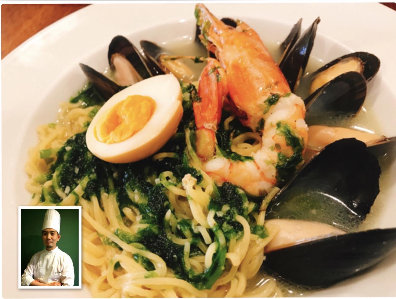 自家製の縮れパスタを魚介たっぷりの生海苔スープで和えたスープパスタ!!
