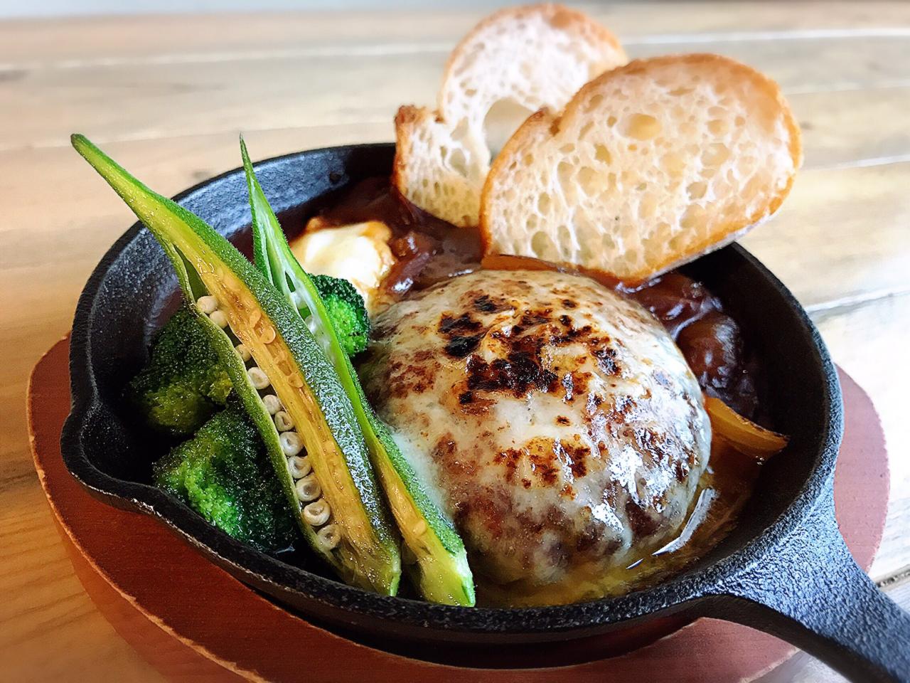 ジューシーで大きなハンバーグにたっぷりのデミグラスソースとこんがり焼き上げたモッツァレラチーズ。