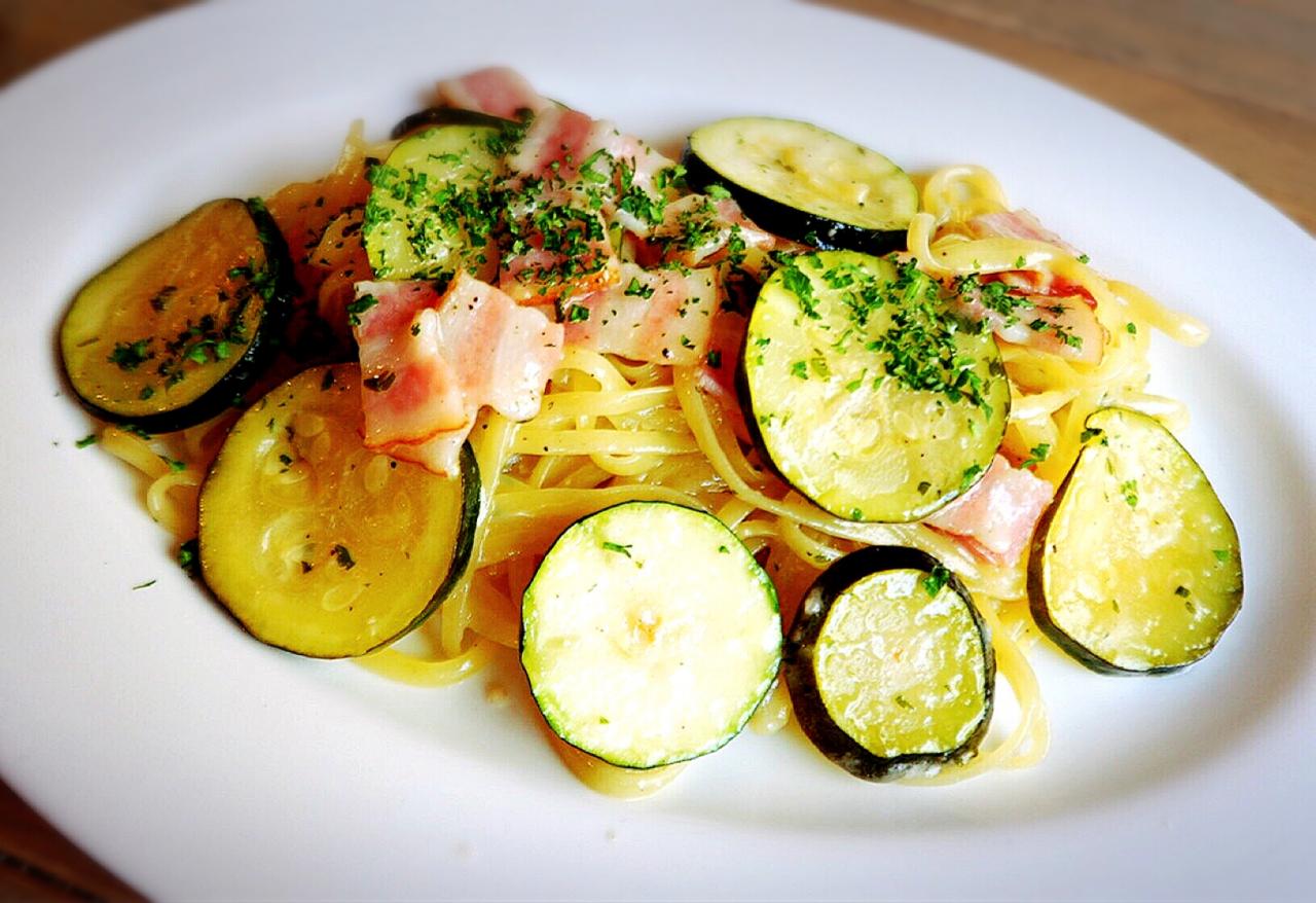 【ズッキーニとベーコンのバターソースパスタ】 旬のズッキーニをたっぷり使用した、優しい味わいのバターソースのパスタ♪