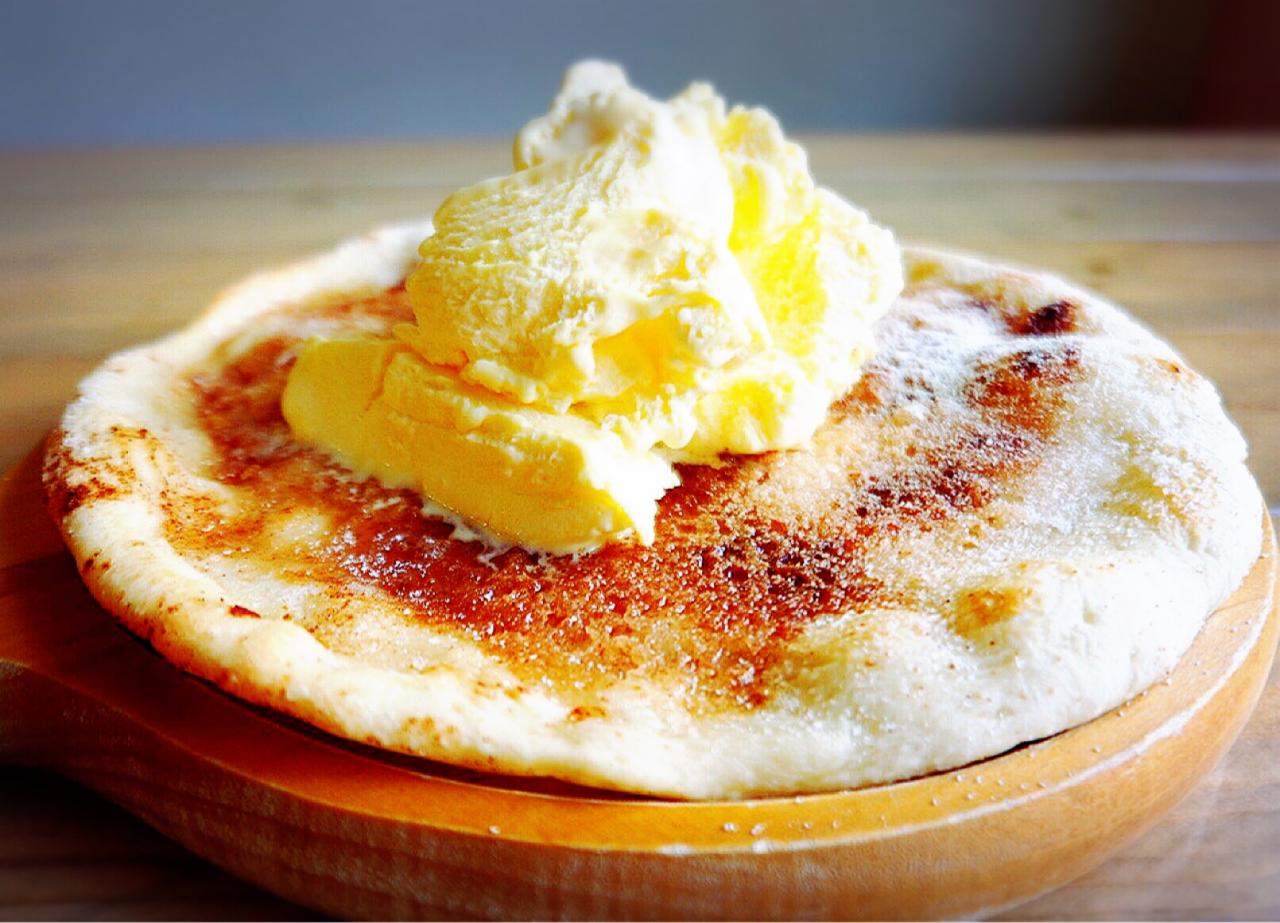 【シナモンシュガーのデザートピザ】 自家製ピザ生地にたっぷりバターとシナモンをかけて焼き上げ、仕上げにアイスクリームを乗せた絶品デザートです♪
