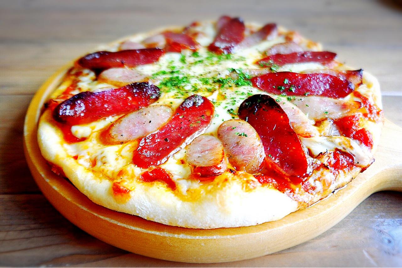 ソーセージとイベリコ豚のサラミがたっぷり乗った、ボリューム満点でお酒にもよく合うおつまみピザです♪