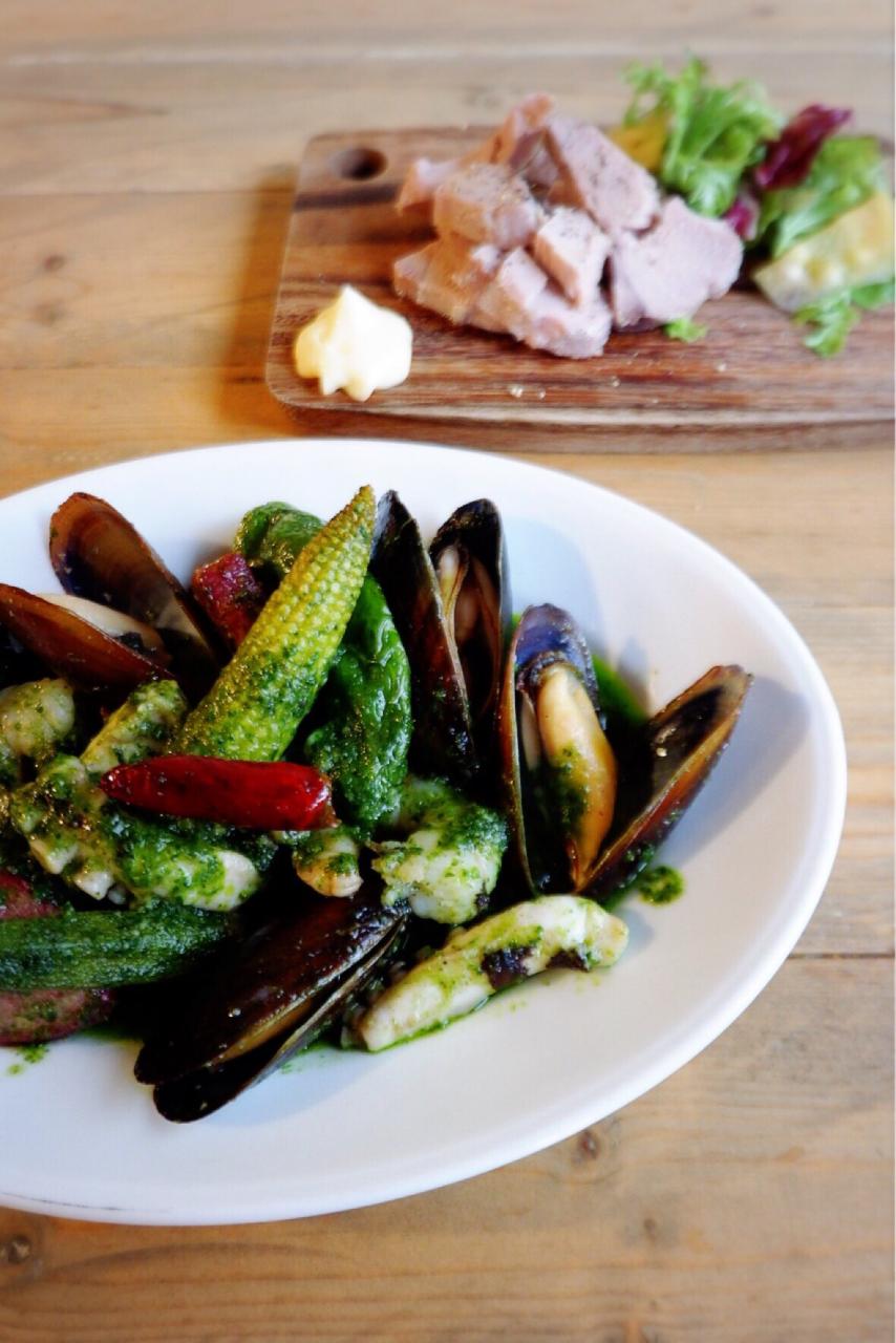 ムール貝やタコなどの魚介と季節のお野菜を自家製のバジルソースでソテーしました!