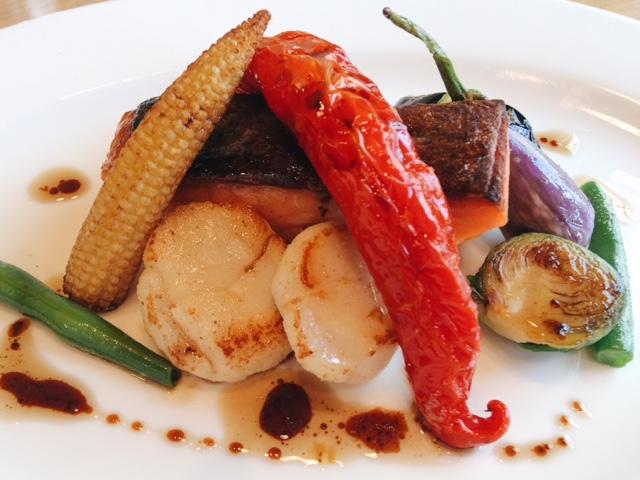今月おすすめのお魚料理は、「自家製スモークサーモンのソテー」です(^^) 厚切りのスモークサーモンとホタテのソテーに焦がしバターとバルサミコのソース。季節野菜たっぷりです! 是非お試し下さいね。 ご来店心よりお待ちしてますm(__)m