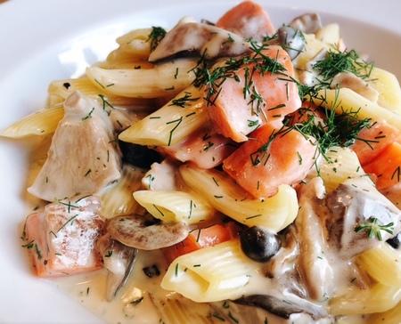 今日のおすすめは サーモンとキノコの レモンクリームペンネ