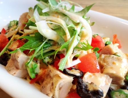 今日はとっても暑いですね( ´•ω•`) みなさん夏バテ大丈夫ですか? そんな暑い日には 若鶏と野菜の冷製ゴマだれパスタが オススメです(*’-'*) 冷たいのでツルッと食べられますよ〜♪ 野菜と鶏肉も乗っているので さっぱりしていて食べごたえもあります‼︎