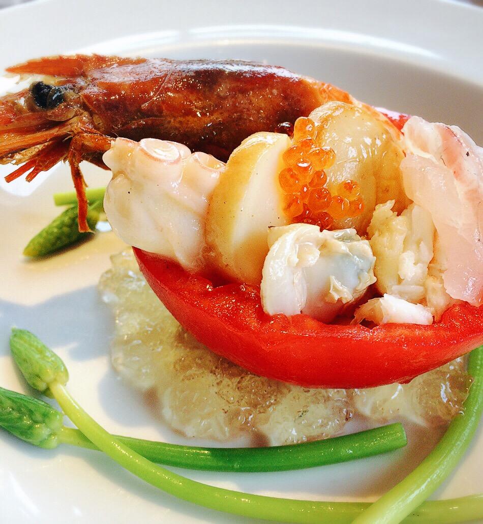 トマトカップの中には、ぜんな蛤、タコ、赤海老、ホタテ、真鯛のマリネ、フレンチキャビア、蟹が詰まったとっても豪華なメニューです! トマトジュレとアスパラソバージュを添えて。 数量限定です(^^)