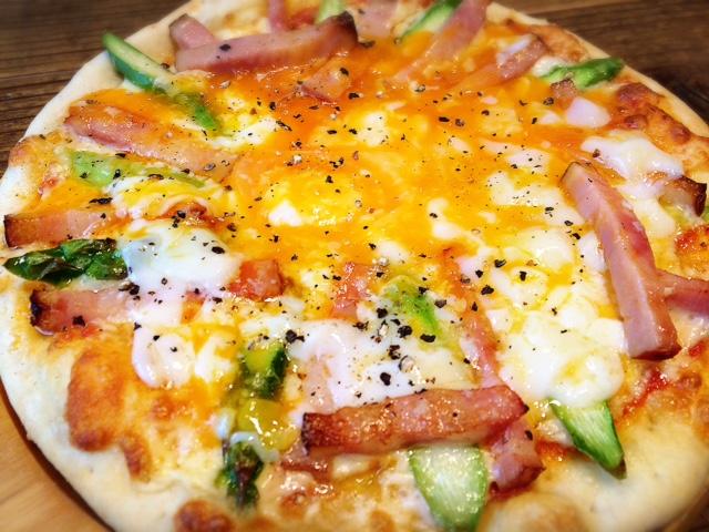 4月のピザ『アスパラとベーコンのビスマルク』シャキシャキのアスパラと、とろーり半熟玉子が人気です! 是非お試し下さい\(^o^)/